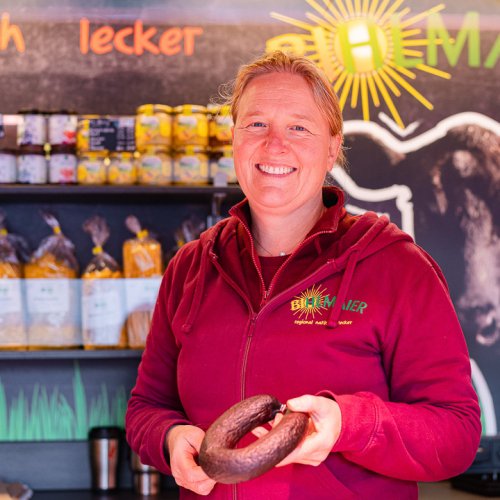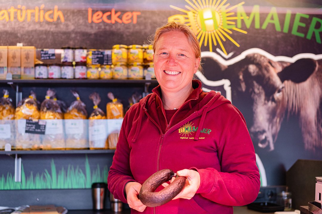 Die fleißigen und überzeugten Fachleute Katja und Rainer Bihlmaier sorgen mit bestem Bioland Bio-Fleisch und Wurstwaren von hofeigenen Angusrindern und Schweinen für zufriedene Kunden.