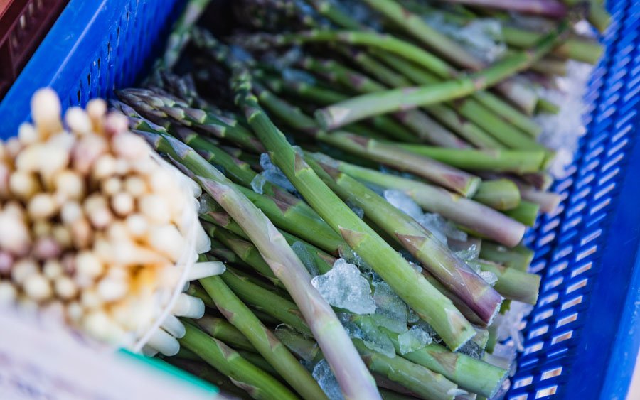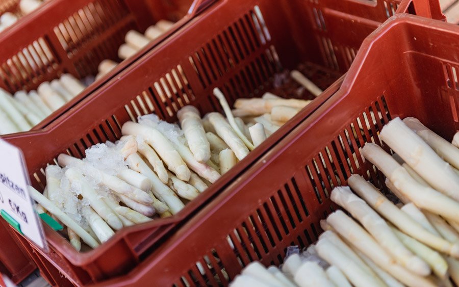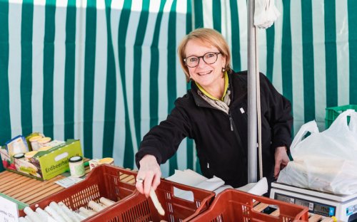 Der Stand vom Erdbeerhof Mall ist eine wahre Farbenpracht: Prall und rot leuchten einem die Erdbeeren schon entgegen. Doch nicht nur Erdbeeren aus eigenem Anbau, auch Spargel und Himbeeren werden von dem Familienbetrieb angeboten.