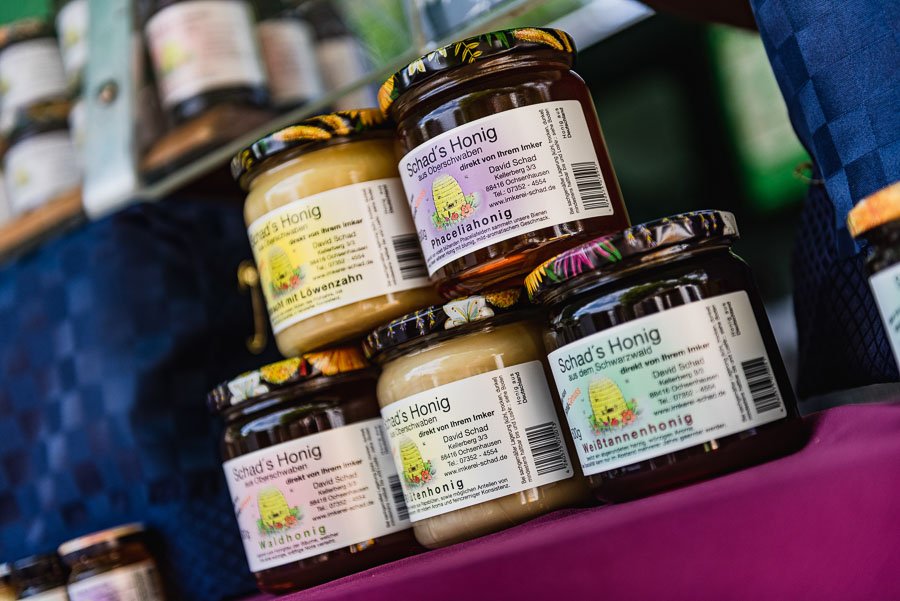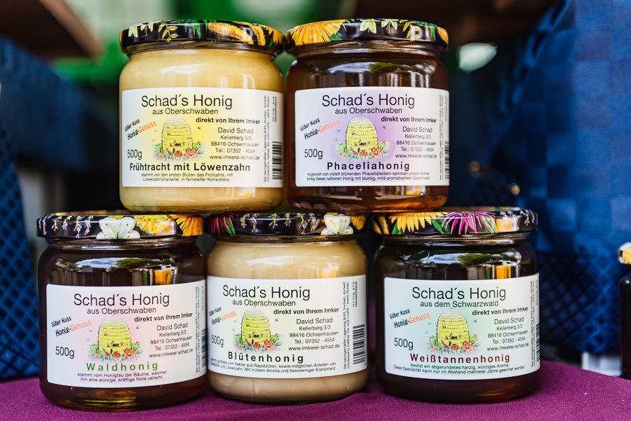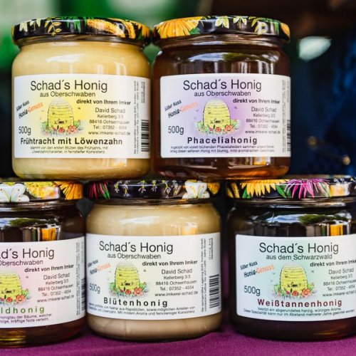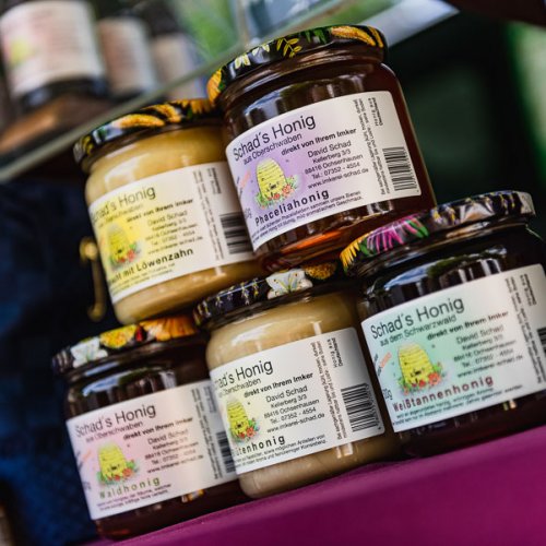 Die Imkerei Schad biete eine Vielfalt an Honigsorten aus der Region. Frühtracht mit Löwenzahn, Blütenhonig, Sommertracht aus der Vielzahl von Sommerblumen sind nur einige Sorten. Ergänzt werden diese durch überregionale Sorten der dienstreisenden Bienen wie z. B. Weißtannenhonig aus dem Schwarzwald.