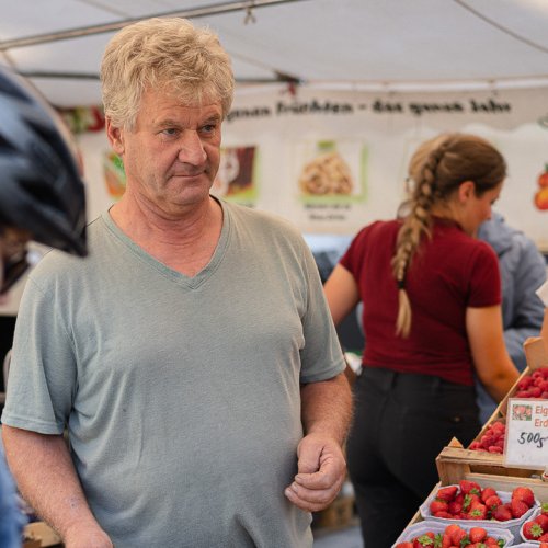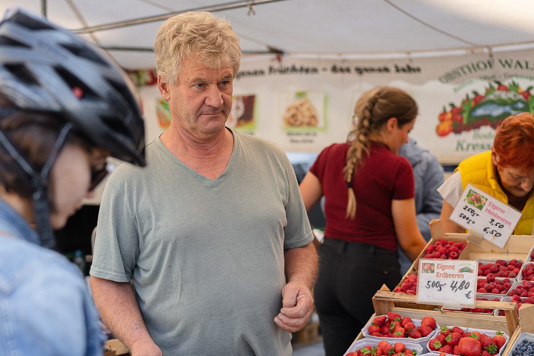 Als Mitglied im einflussreichen Marktausschuss schätzen ihn seine Kollegen als hilfsbereiten und fachkundigen Marktbeschicker. Und die Kollegen schätzen es auch, wenn er morgens mit seinem Verkaufswagen vorbei fährt: Zu gut duften wieder die Beeren und Früchte, die von der eigenen Obstplantage bei Kressbronn am Bodensee nach Ulm kutschiert werden.